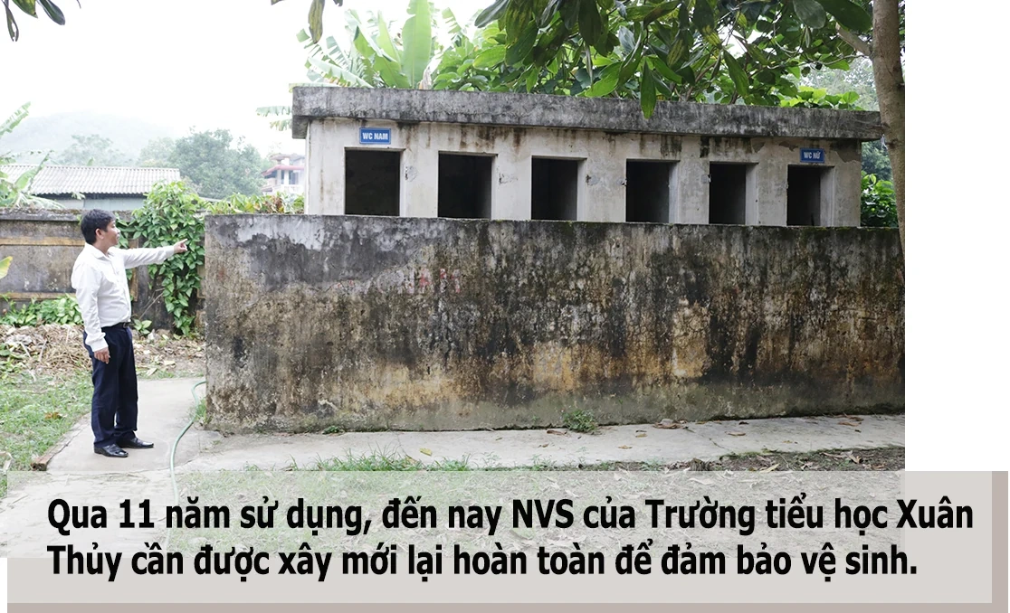 Trường tiểu học Xuân Thủy, huyện Yên Lập có 482 học sinh, chỉ có 2 NVS nhưng đã xuống cấp trầm trọng, trong đó có 1 NVS được xây dựng từ hàng chục năm trước, không có bệ rửa tay, tường thấm nước mọc rêu loang lổ, bốc mùi. Ông Lê Đức Tiến - Hiệu trưởng trường chia sẻ: Phụ huynh học sinh trong trường chủ yếu là nông dân, công nhân, điều kiện kinh tế rất khó khăn nên việc xã hội hóa xây dựng các công trình phụ gần như là không thể, còn nếu sửa chữa thì chỉ được một thời gian là xuống cấp. Đó là lý do năm 2007, khi xây dựng trường chuẩn Quốc gia cấp độ 1, nhà trường phải nợ lại tiêu chí NVS. Từ đó đến nay, vẫn chưa có điều kiện sửa chữa lại. Với hiện trạng như hiện nay chỉ có thể phá bỏ NVS cũ để xây mới.