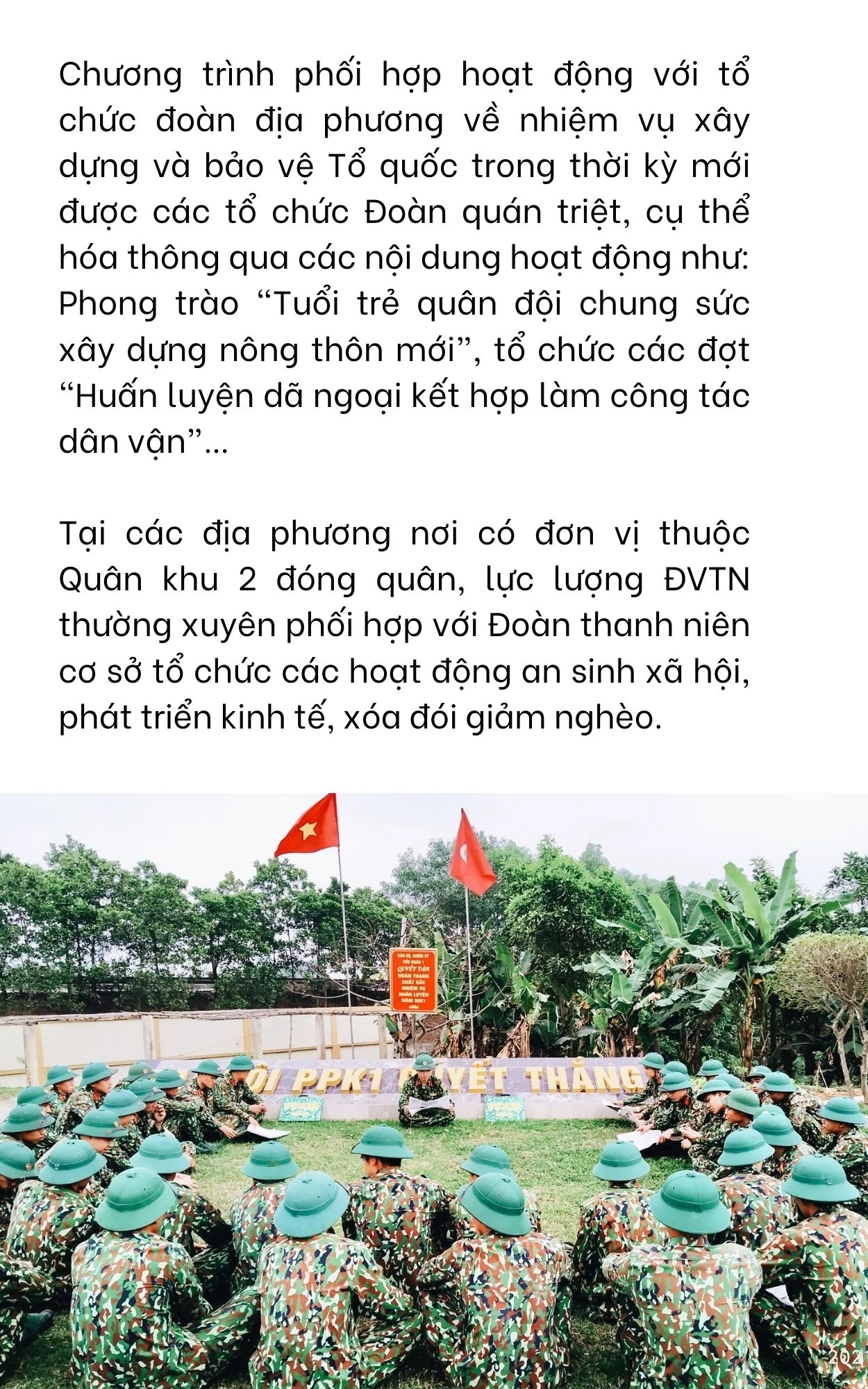 Thời gian qua các cơ quan, đơn vị thuộc Quân khu 2 có nhiều hoạt động trên thao trường, các chiến sĩ ra sức thi đua luyện giỏi, rèn nghiêm. Trong rèn luyện kỷ luật, xây dựng chính quy, các tổ chức Đoàn đã thường xuyên tổ chức tốt các đợt thi đua đột kích vào thực hiện ba khâu đột phá của Quân khu, tập trung đột phá về kỷ luật, như phong trào ba xung kích: “Đi đầu trong thực hiện nền nếp chế độ canh trực SSCĐ; chấp hành nghiêm kỷ luật Quân đội pháp luật Nhà nước; đi đầu trên mặt trận đấu tranh phòng chống các tệ nạn xã hội, mê tín dị đoan.