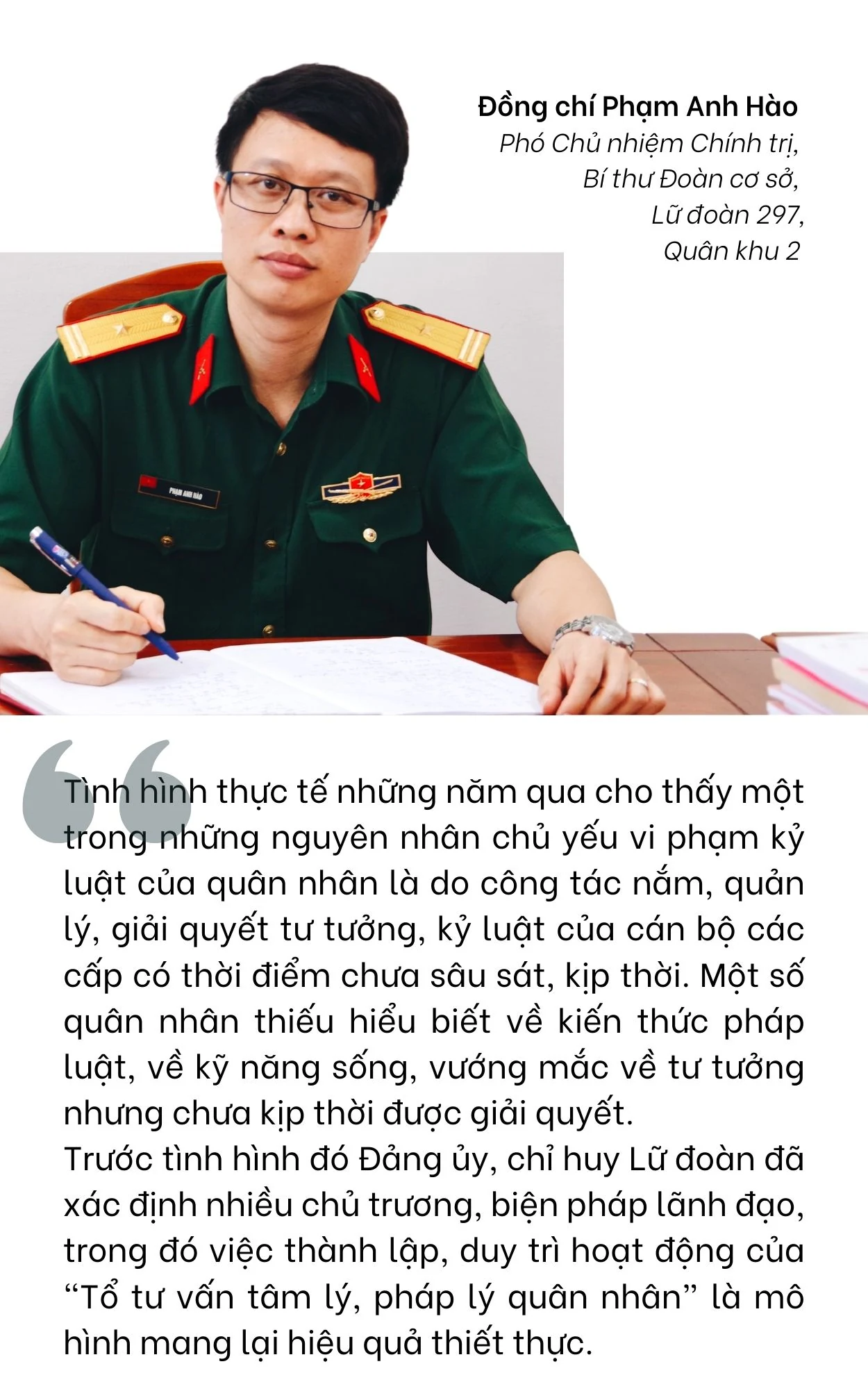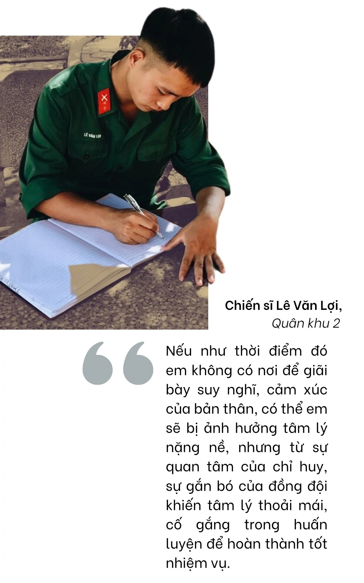 Sinh năm 2000, quê ở Văn Yên, Yên Bái, nhập ngũ năm 2020, vừa mới những ngày đầu huấn luyện chưa quen với nền nếp, kỷ luật quân đội, chiến sĩ Lê Văn Lợi đã nhận ngay tin dữ từ gia đình: Bố mất! Hụt hẫng, buồn rồi sau đó là lo lắng cho mẹ, cho em ở quê nhà khiến tâm trạng và tâm lý của Lợi bất ổn. Lợi tìm đến “Tổ tư vấn tâm lý, pháp lý quân nhân”của đơn vị.