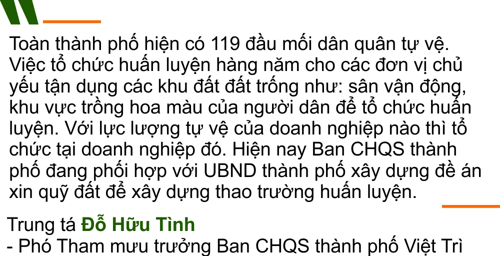 Thao trường huấn luyện là yếu tố có ảnh hưởng trực tiếp đến chất lượng huấn luyện, khả năng sẵn sàng chiến đấu của lực lượng vũ trang trong KVPT. Tuy nhiên, vấn đề quy hoạch, bố trí thao trường huấn luyện của các xã, phường, thị trấn tại các huyện, thành, thị còn gặp không ít khó khăn. Tại TP Việt Trì, mỗi khi huấn luyện cho lực lượng dân quân, tự vệ các đơn vị, địa phương đều phải tận dụng một số công trình như sân vận động, trường học, những cụm khu di tích, hay những khu vực trồng hoa màu của nhân dân, nên đã ảnh hưởng tới chất lượng huấn luyện.