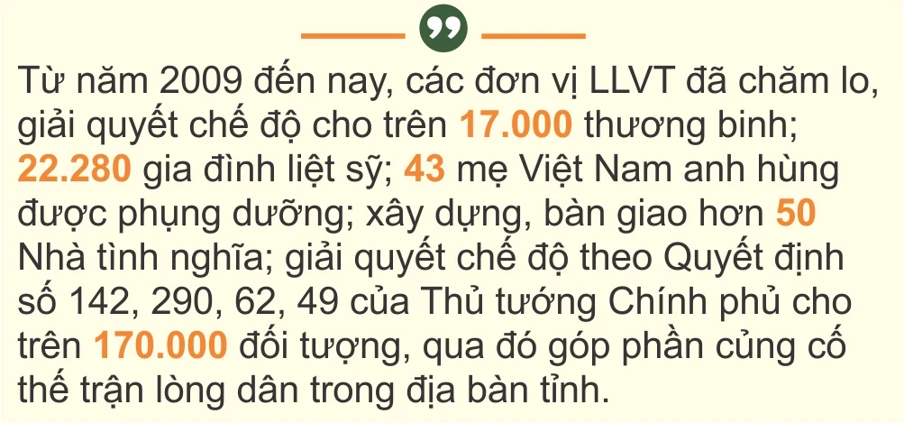 Củng cố niềm tin của nhân dân với Đảng, với quân đội, LLVT tỉnh đã xây dựng nhiều hoạt động sáng tạo như: Tổ chức huấn luyện kết hợp với hoạt động dân vận; “Tết Quân Dân”; “LLVT chung tay vì người nghèo - Không để ai bị bỏ lại phía sau”; chỉ đạo thực hiện tốt các chính sách xã hội, nhất là hệ thống chính sách phục vụ cho nhiệm vụ bảo vệ Tổ quốc như: Chính sách hậu phương quân đội, chính sách gia đình liệt sỹ và người có công, chính sách đối với việc thực hiện luật về quốc phòng, an ninh.