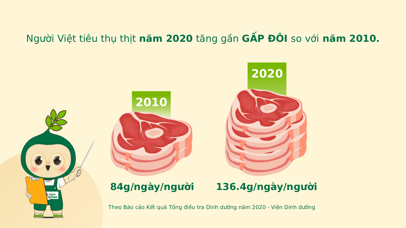 Tổng điều tra dinh dưỡng toàn quốc 2019-2020 cho thấy, mức tiêu thụ thịt trung bình là 136,4g/người/ngày (năm 2020), tăng gần gấp đôi so với năm 2010 là 84g/người/ngày. Theo các chuyên gia, tỷ lệ đạm thực vật mà người Việt tiêu thụ chỉ đạt khoảng 28% so với lượng khuyến nghị, khoảng 59% người trưởng thành ăn thiếu rau và trái cây (dưới 400g/ngày) so với khuyến nghị.