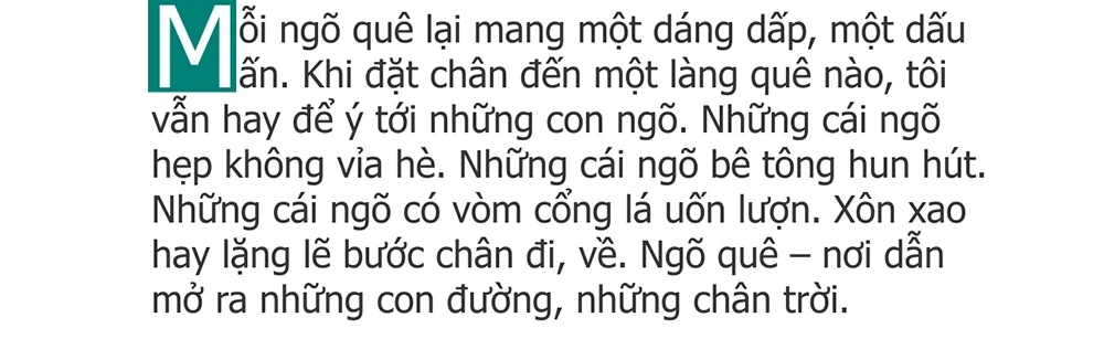 Ngõ quê, vừa như để mở ra, mà như vừa để khép lại. Nó là con sông nhỏ để đổ ra dòng sông lớn là đường làng ngoài kia, để từ đường làng lại ra với tỉnh lộ, quốc lộ. Ngõ quê – nơi đầu tiên mở ra những con đường, những chân trời. Và cũng ngõ quê, khép lại một ngày rộn rã náo nhiệt, khép lại một cánh cổng để về quây quần bên nếp nhà, với bao nhiêu buồn vui, thăng trầm, khổ đau, hạnh phúc…