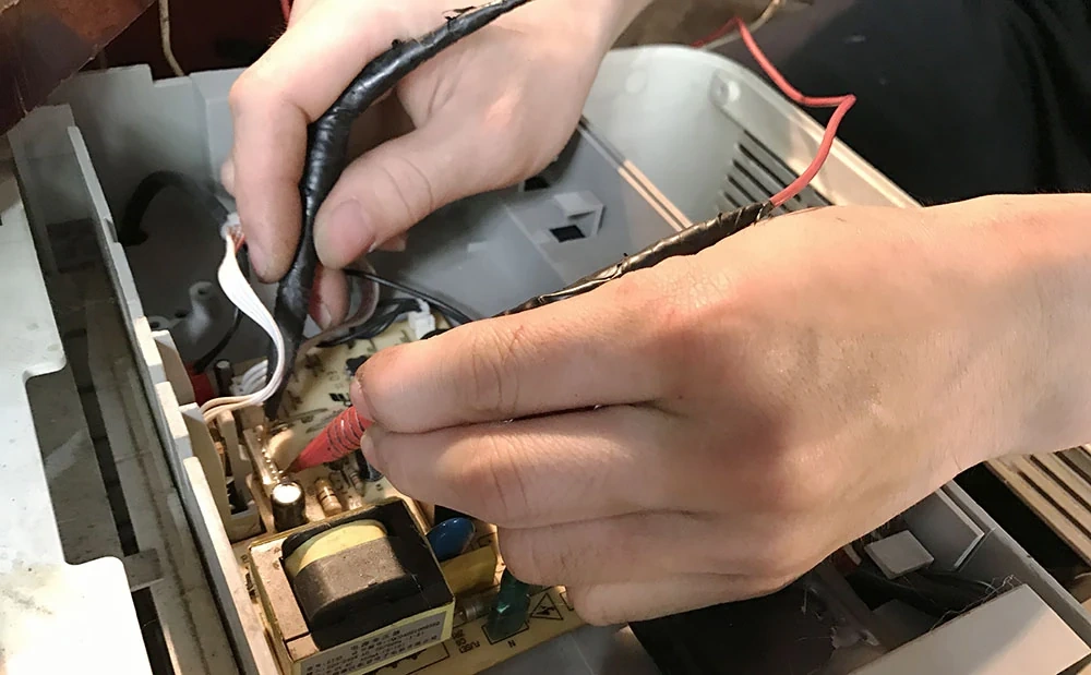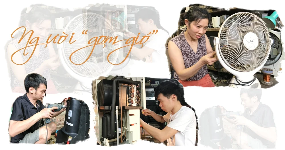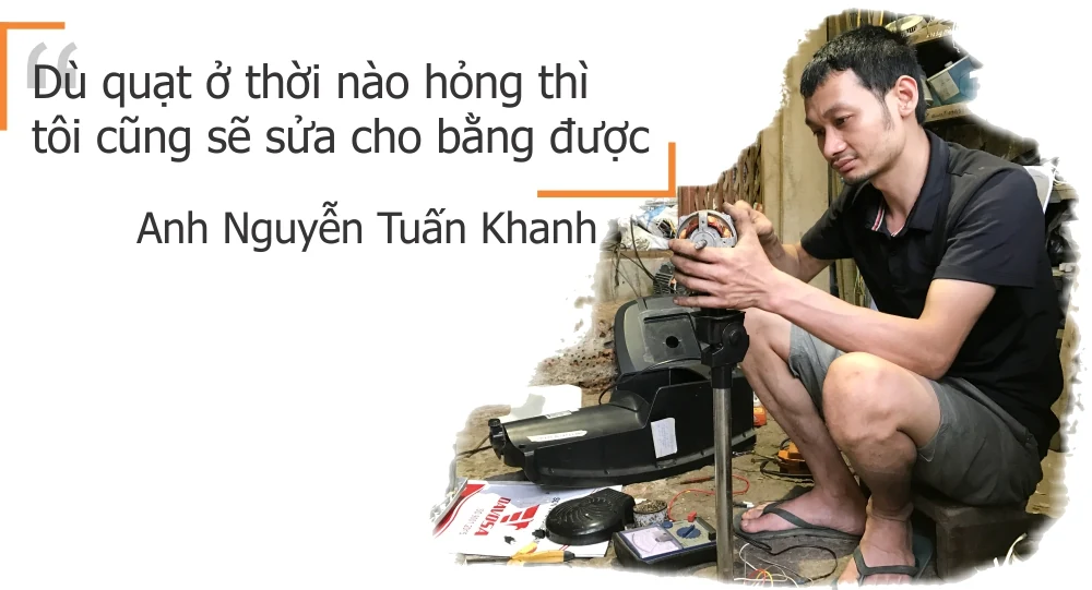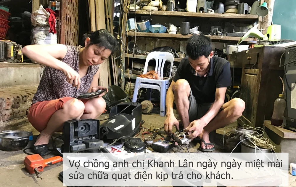 Mới đầu hè nhưng thời tiết khá oi ả, đây cũng là thời điểm gia đình anh Nguyễn Tuấn Khanh và chị Nguyễn Thị Lân (chủ cửa hàng sửa chữa đồ gia dụng Khanh Lân) bận rộn với khách hàng. Trong không gian cửa hàng chỉ chừng hơn chục mét vuông đủ để chứa những thiết bị máy móc, vật liệu và những chiếc quạt đã cũ xếp hàng chờ đến lượt sửa chữa, miệng nói cười, trò chuyện với chúng tôi nhưng tay mắt anh chị vẫn không rời những chiếc quạt cần sửa chữa để kịp trả cho khách.