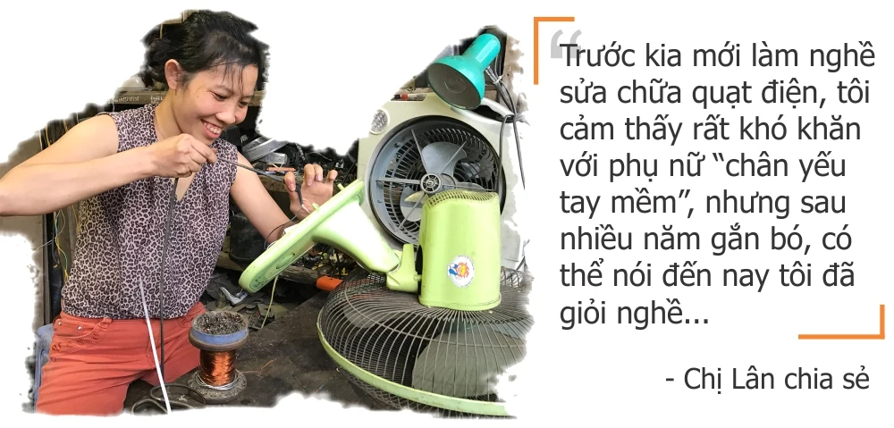 Khi lập gia đình, vợ anh chị Lân mặc dù là phụ nữ “chân yếu tay mềm” cũng có nhiều ước mơ làm những nghề phù hợp với phụ nữ hơn, song vì muốn vợ chồng cùng tập trung làm dịch vụ nên chị cũng quyết định đi học tại trường chồng chị từng học. Chị chia sẻ: “Ban đầu chưa quen, công việc này thực sự khó khăn với phụ nữ. Nhưng thấy chồng và gia đình nhà chồng say nghề, ngày ngày miệt mài với công việc sửa chữa điện tử, điện cơ, nhất là quạt điện mình cũng cảm thấy dần yêu nghề và giỏi nghề”.
