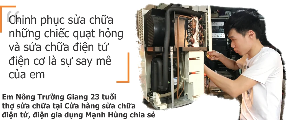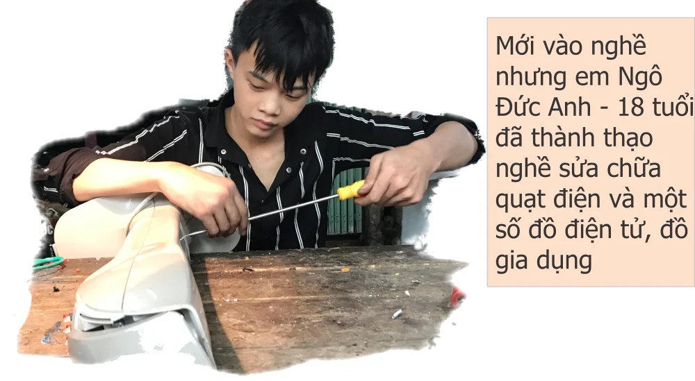 Không chỉ những gia đình, những cặp vợ chồng như anh chị Khanh Lân, mà nghề sửa quạt điện nói riêng, sửa chữa điện tử, điện cơ nói chung cũng thu hút, tạo việc làm cho nhiều bạn trẻ. Cùng sát cửa hàng với anh chị Khanh Lân, còn có các bạn tuổi đời rất trẻ cũng đang theo nghề sửa chữa quạt điện, các loại đồ dùng gia dụng, điện tử, điện cơ tại cửa hàng Mạnh Hùng. Dù tuổi đời và kinh nghiệm chưa nhiều, nhưng bằng sức trẻ, sự tâm huyết, yêu nghề cũng đã làm nên thành công bước đầu cho các em ở mức lương từ 5-6 triệu/tháng.