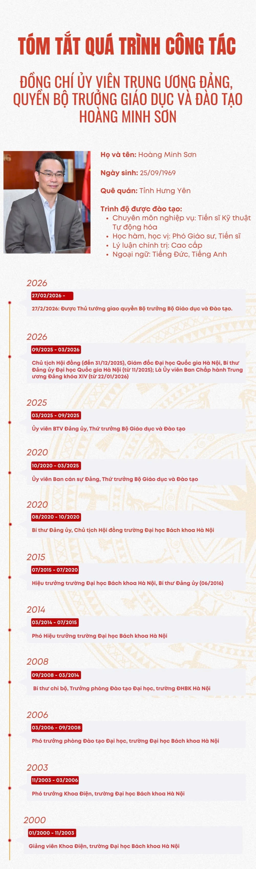 Thủ tướng Chính phủ đã ký Quyết định số 356/QĐ-TTg ngày 27/2/2026 điều động và giao Quyền Bộ trưởng Bộ Giáo dục và Đào tạo cho đồng chí Hoàng Minh Sơn - Ủy viên Trung ương Đảng, Giám đốc Đại học Quốc gia Hà Nội.